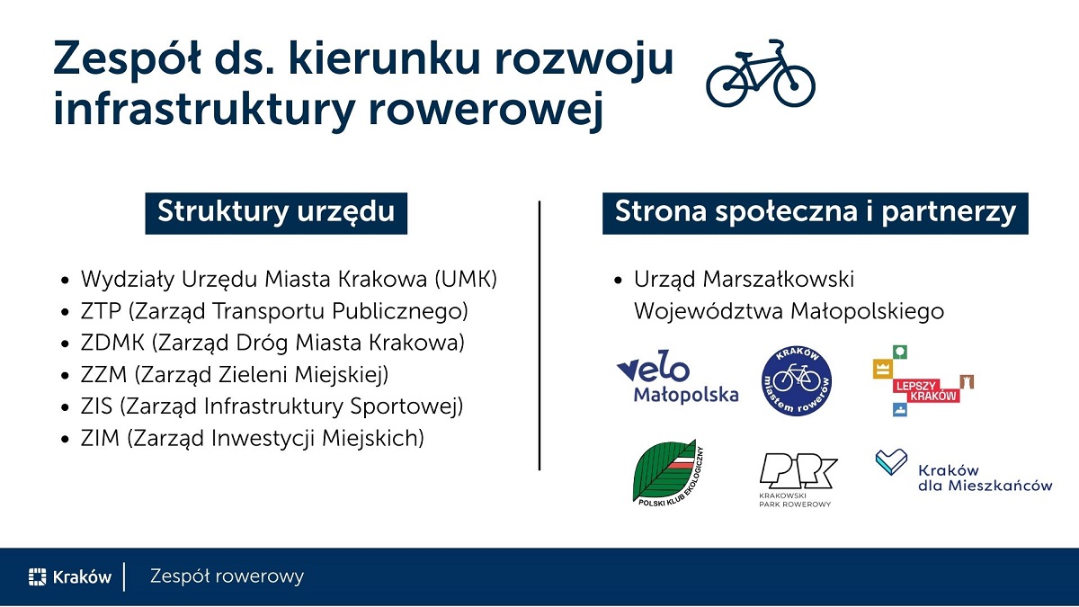 Ważne jest też to, kto wypracował rekomendację. Tematem nie zajmował się wyłącznie urząd „we własnym gronie”. Od lipca 2024 r. działa Zespół Zadaniowy ds. kierunku rozwoju infrastruktury rowerowej Miasta Krakowa, powołany zarządzeniem Prezydenta. To ciało rzeczywiście interdyscyplinarne. Z jednej strony zasiadają w nim przedstawiciele miejskich jednostek: ZTP, Centrum Zarządzania Ruchem, Zarządu Dróg Miasta Krakowa, Zarządu Zieleni Miejskiej, Zarządu Inwestycji Miejskich, Wydziału Miejskiego Inżyniera Ruchu, Wydziału Kształtowania Środowiska, Wydziału Skarbu Miasta i Zarządu Infrastruktury Sportowej. Z drugiej — przedstawiciele strony społecznej i eksperckiej: Kraków Miastem Rowerów, Krakowski Park Rowerowy, Stowarzyszenie Lepszy Kraków, Velo Małopolska i Stowarzyszenie Kraków dla Mieszkańców. To bardzo istotne, bo pokazuje, że nie mamy tu do czynienia z arbitralnym stanowiskiem samego urzędu. To jest efekt pracy środowiska, w którym zasiadają również aktywiści, eksperci i przedstawiciele organizacji od lat zajmujących się tematyką rowerową w Krakowie.