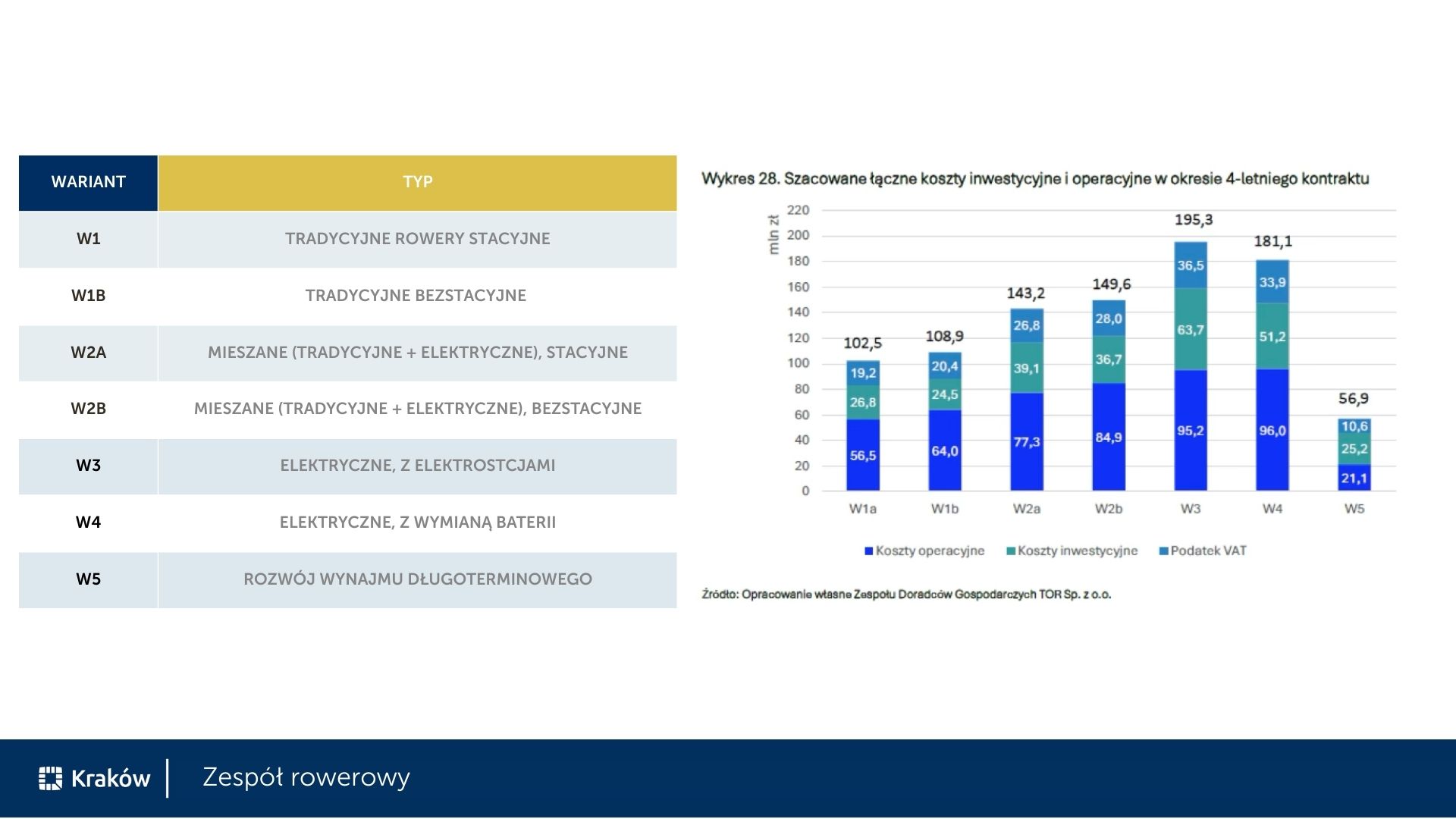 W zleconej analizie rozpatrzono siedem wariantów rozwoju systemu roweru publicznego, przy założeniu floty 3010 rowerów i czteroletniego okresu działania. Były tam zarówno warianty stacyjne i bezstacyjne, jak i systemy mieszane, elektryczne oraz model najmu długoterminowego.